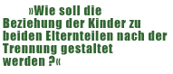 Für die Kinder müssen neue Regelungen gefunden werden. Mediation ist hier eine Hilfe bei der Neu-Organisation. Sie ermöglicht es, den Vorstellungen des anderen zuzuhören, um zu überprüfen, inwieweit auch dessen Ideen sinnvoll sind. Grundsätzlich erhalten nach einer Trennung oder Ehescheidung beide Eltern das gemeinsame Sorgerecht und können folglich weiterhin gemeinsam Entscheidungen für die Kinder treffen. In der Mediation übernehmen die Eltern die Verantwortung für die Regelung mit den Kindern (und nicht das Familiengericht oder die Kinder). Anstelle von Standardlösungen (wie Wochenende beim Vater von Freitag 18:00 Uhr bis Sonntag 18:00 Uhr) können in der Mediation Regelungen entwickelt werden, die den Interessen und beruflichen Vorgaben dieser speziellen Familie entsprechen.